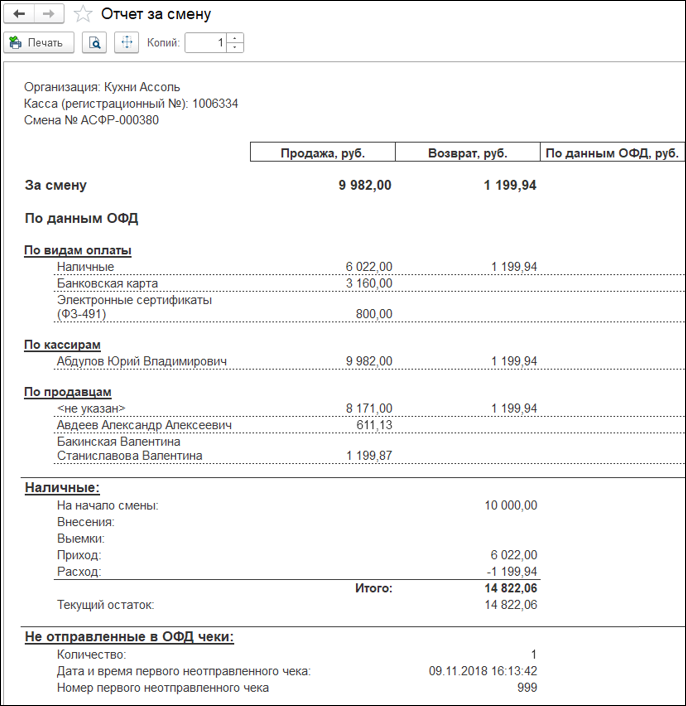В фискальном чеке в режиме рабочего места кассира будет заполняться из кассира, выбранного для входа.