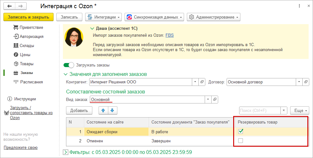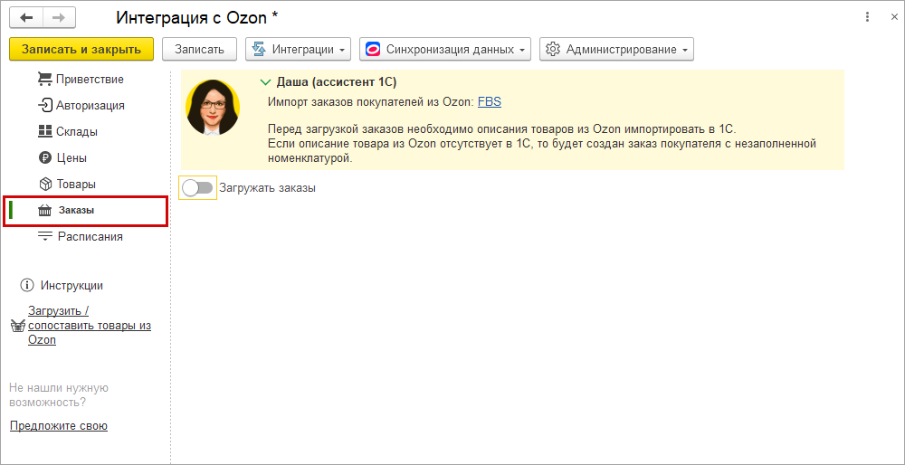 Для оперативной обработки заказов реализована загрузка заказов из марекетплейса в программу, в настройке интеграции появилась закладка "Заказы".