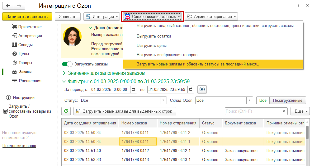 Сведения о поступивших заказах загружаются в 1С автоматически (с помощью регламентного задания) или по кнопке "Синхронизация данных" – "Загрузить новые заказы и обновить статусы за последний месяц".