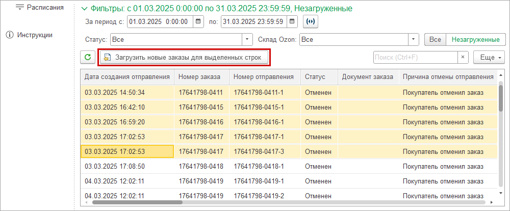 По данным каждого заказа маркетплейса можно создать документ "Заказ покупателя". Для этого достаточно выбрать строки заказов маркетплейса и нажать "Загрузить новые заказы для выделенных строк".