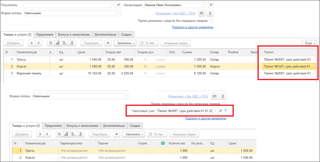 Примененные патенты будут отображаться в табличной части документа. Теперь кассир может объединить все товары в один чек без необходимости печатать отдельный чек на каждый патент.