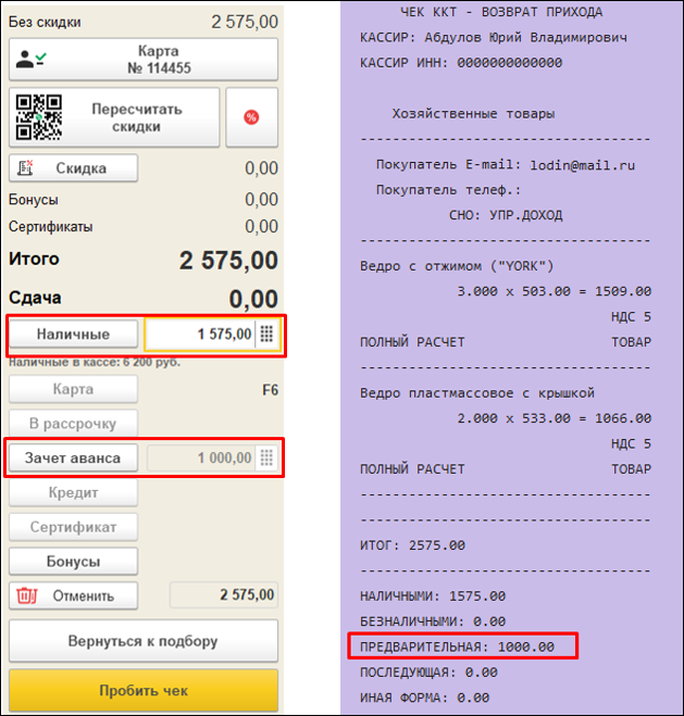 Упростили схему работы в режиме предоплаты, когда используются два чека. Добавили возможность оформить возврат товаров с сохранением предоплаты покупателя. Если клиенту не подошел товар, но он готов приобрести аналогичный, то удобно оформить только возврат товара, а по внесенной предоплате отгрузить новый товар. Для этого при заполнении чека на возврат добавили кнопку "Зачет аванса", при нажатии на которую отобразится сумма аванса. Нужно скорректировать сумму чека с учетом аванса. После пробития чека сумма аванса восстановится за покупателем, ее можно зачесть повторно.