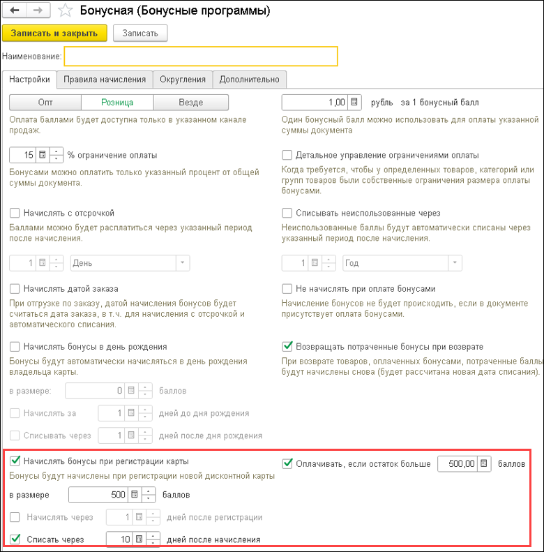 Привлекать покупателей становится проще. Добавили возможность начислять приветственные баллы при регистрации дисконтной карты. Для этого в бонусной программе предусмотрен одноименный флажок. Здесь же можно указать количество начисляемых баллов, когда их начислить и через сколько дней списать. Дополнительно появилась возможность ограничить оплату баллами, если остаток на балансе меньше указанного в настройке.