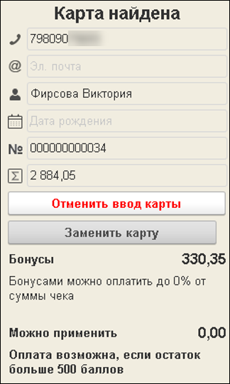 При считывании карты произойдет сверка остатка бонусных баллов и установленного значения настройки "Оплачивать, если остаток больше...". Программа предупредит, если остаток ниже заданного и оплата бонусами будет недоступна.