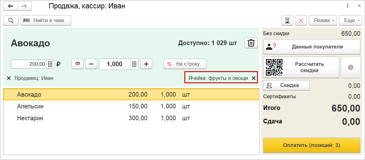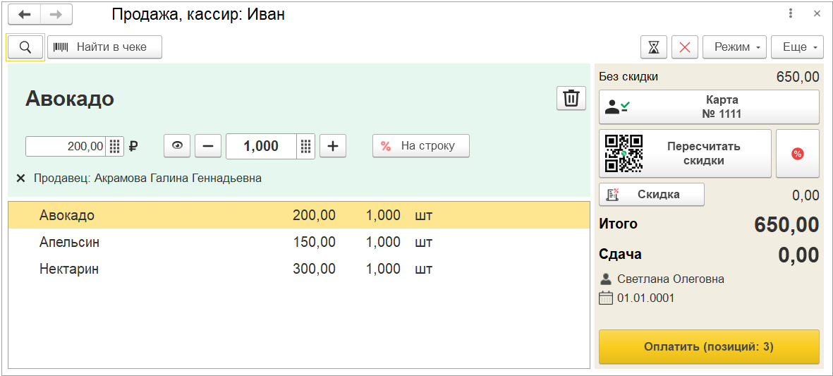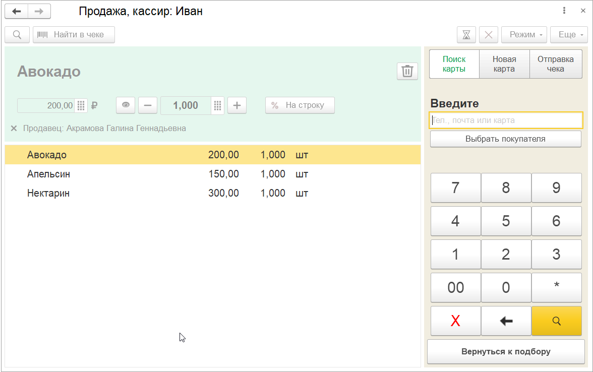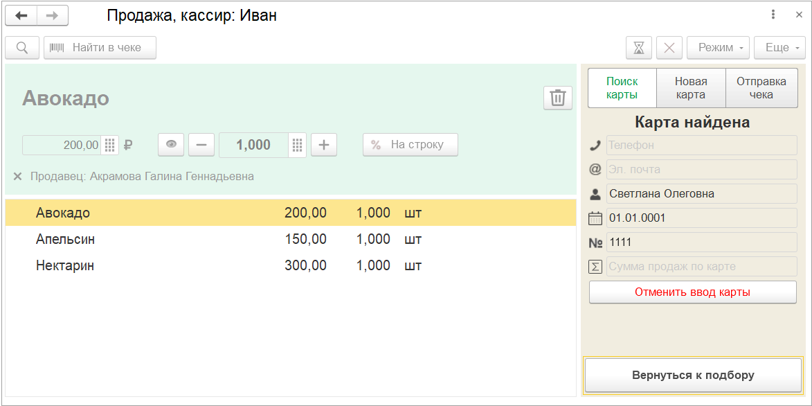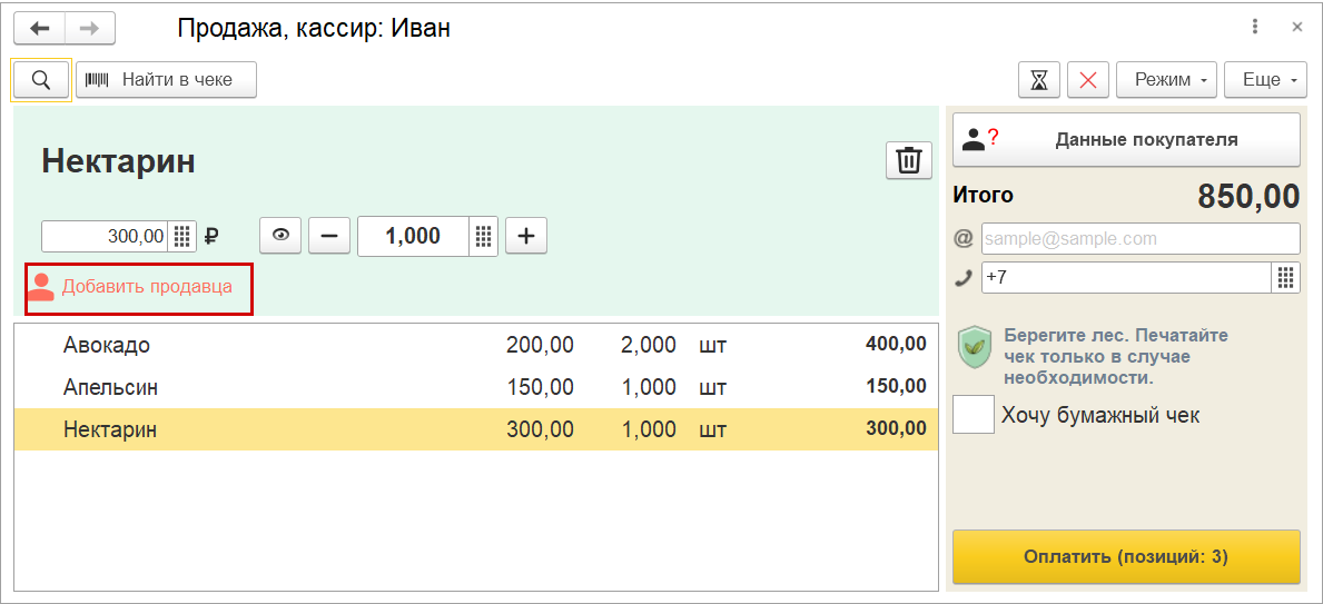 Если таблица товаров не пуста и разрешен выбор продавца, то найденный сотрудник будет заполнен во все строки чека, у которых не заполнен продавец.