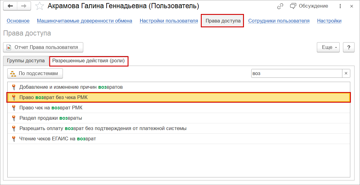 Теперь сделать возврат без чека может только старший кассир. Для проверки прав доступа перейдите в карточку пользователя (раздел: Настройки - Настройки пользователей и прав) в разделе "Права доступа" . На закладке "Разрешенные действия (роли)" не должно быть "Права на возврат без чека РМК". По умолчанию данное право предоставлено старшему кассиру.