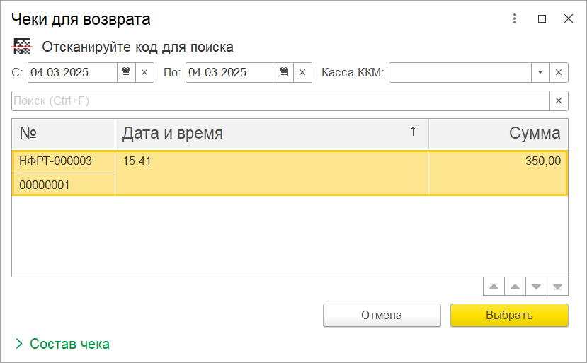 На формах выбора чека на возврат и отложенного чека можно посмотреть товары в чеке. Для этого можно развернуть группу "Состав чека". Кроме того, в отложенном чеке теперь можно сохранять данные дисконтной карты и рассчитанные скидки.