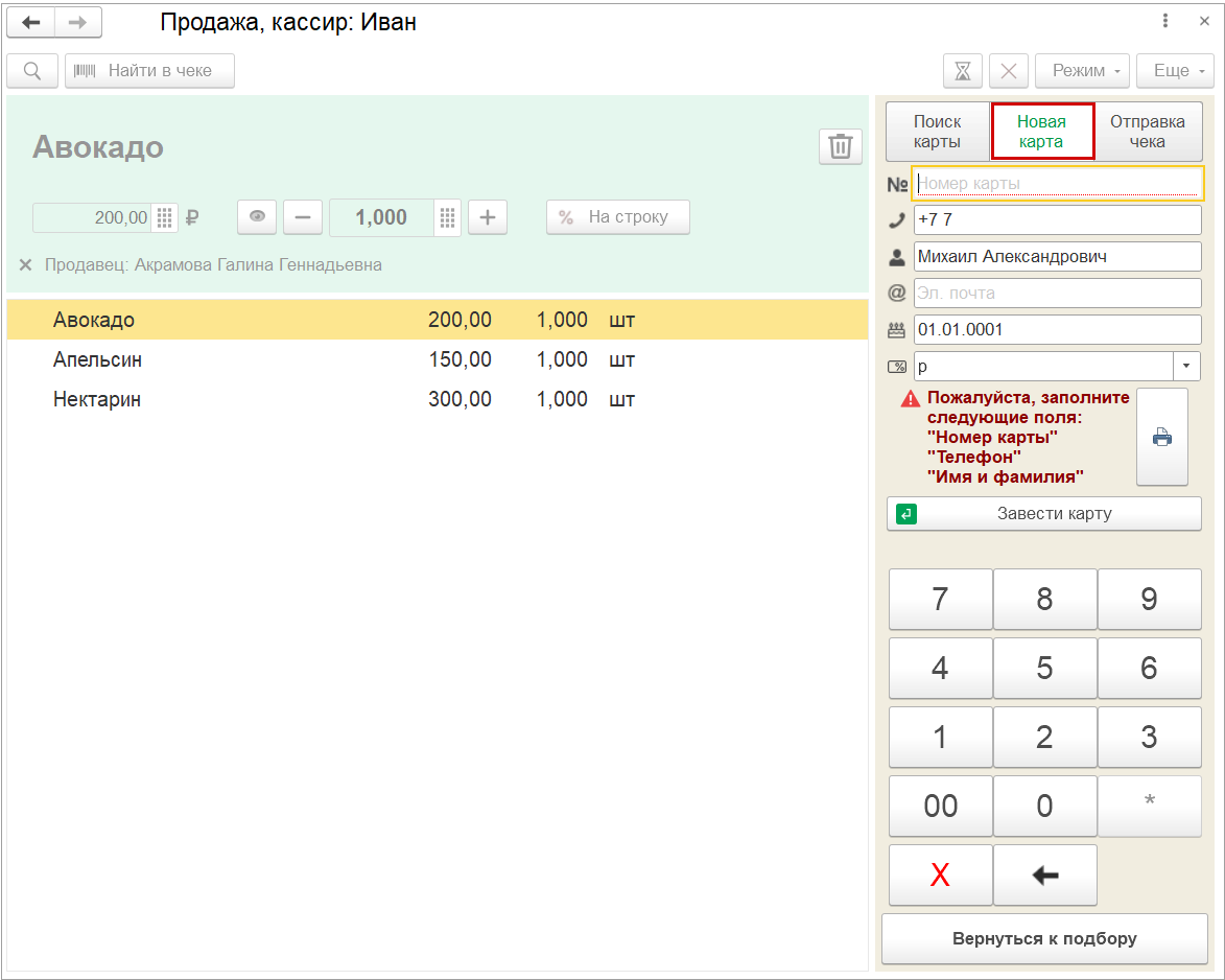 Также можно подключить проверку заполнения продавца. Оплату невозможно будет провести, если продавец не заполнен, а значок продавца будет отображаться красным. Для подключения функции убедитесь в том, что выбор продавца разрешен, и установите флажок "Проверить заполнение продавца" в "Настройках рабочего места кассира".