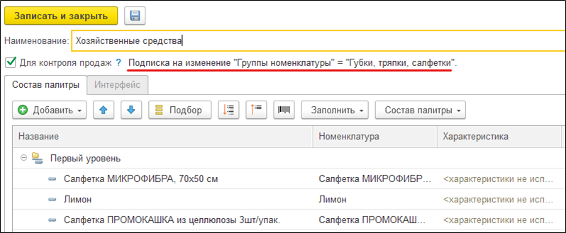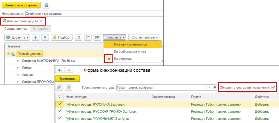 Добавлять определенные позиции в состав палитры и контроля продаж, а также обновлять их по настроенному отбору теперь можно автоматически. Палитру можно заполнить номенклатурой, отобранной по виду, особенностям учета или по иерархии. Для контроля продаж теперь можно настроить автообновление.