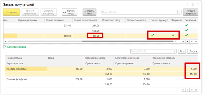 В форме заказов для закрытых заказов отобразятся неотгруженные товары с суммой.