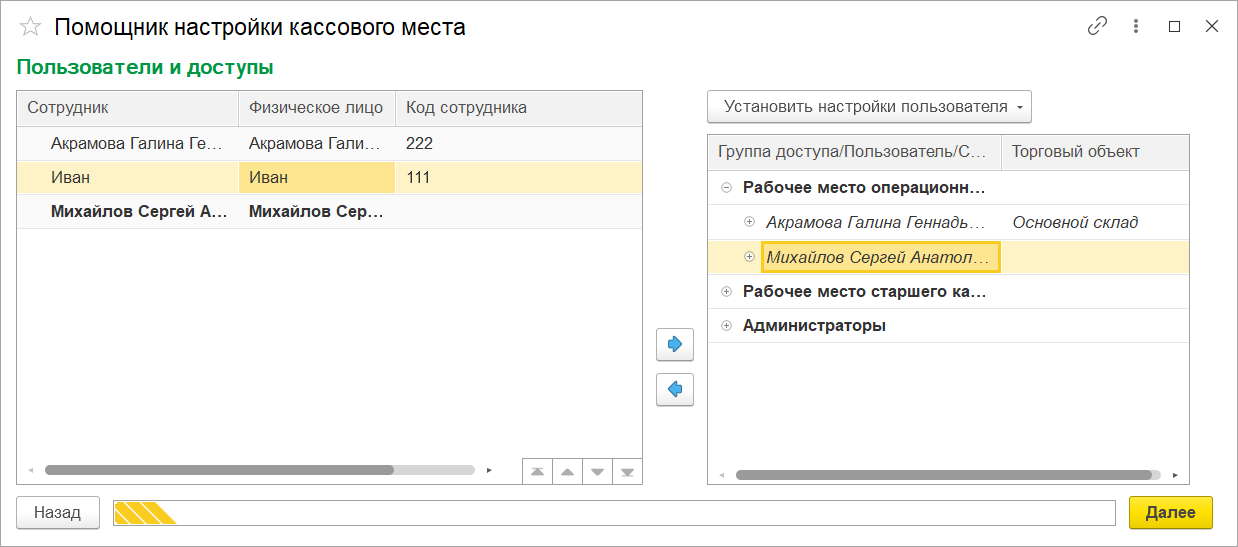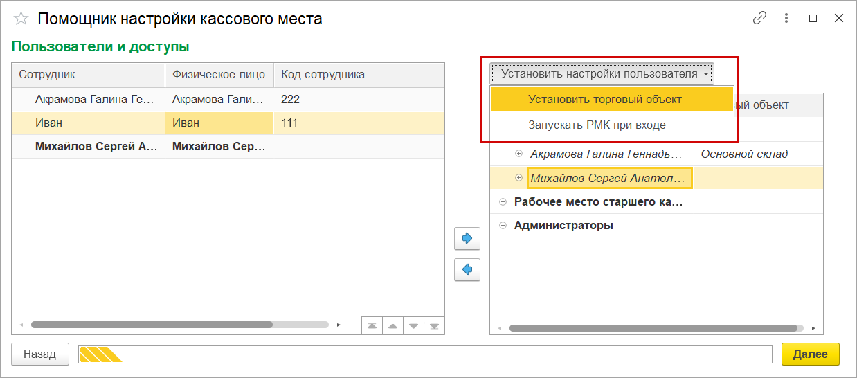 Для привязки кассира к торговому объекту по кнопке "Установить настройки пользователя" выберите вариант "Установить торговый объект". Для запуска РМК при входе для определенных пользователей выберите пользователя и по кнопке "Установить настройки пользователя" выберите вариант "Запускать РМК при входе".