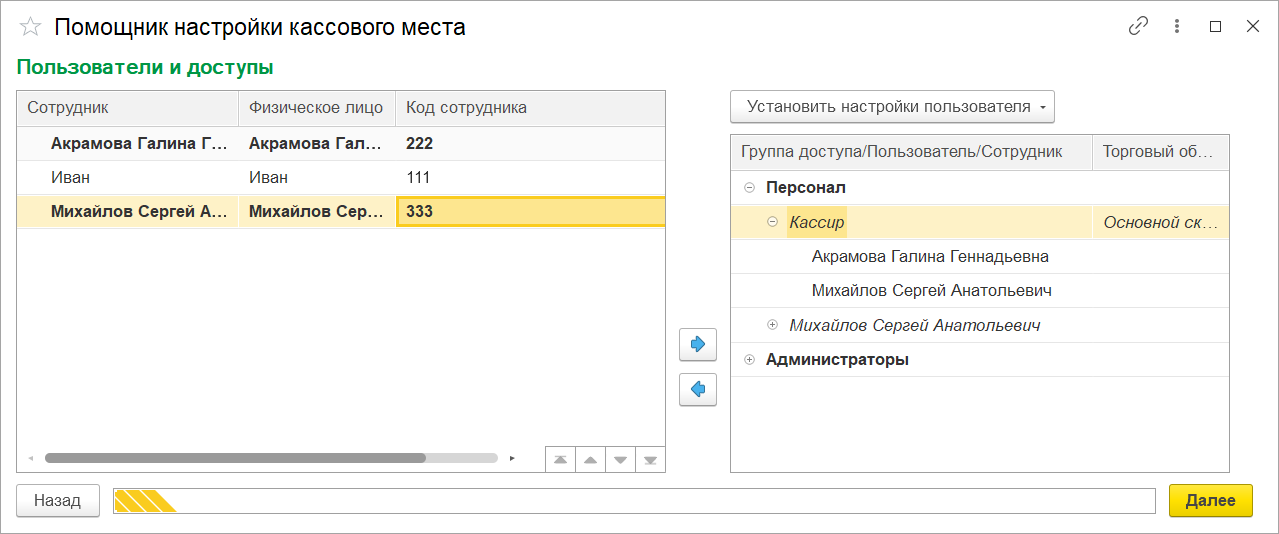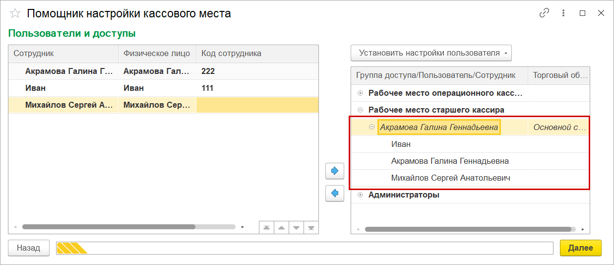 Все настройки пользователя можно изменить непосредственно в карточке пользователя. Для этого необходимой зайти в раздел Настройки - Настройки пользователей и прав - Пользователи - папка "Рабочее место кассира", Настройки в карточке пользователя. Список сотрудников пользователя можно изменить в карточке пользователя, на закладке "Сотрудники пользователя".