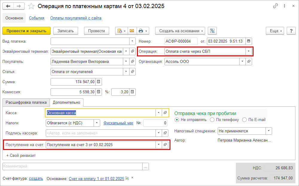 В документе "Операция по платежным картам" для отражения прямой оплаты от покупателя появилась операция "Оплата счета через СБП". При выборе этой операции на закладке "Дополнительно" заполняется соответствующее "Поступление на счет".