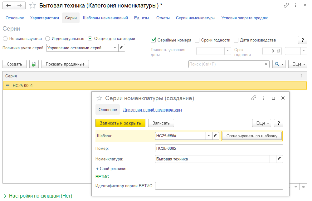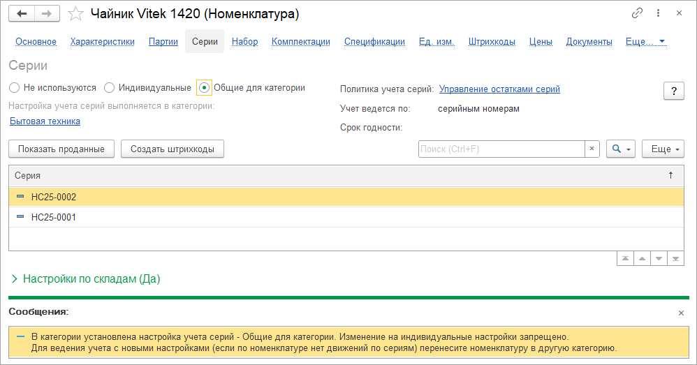 Для категории также можно указать индивидуальные настройки серий по складам.
