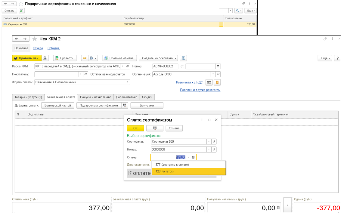 После выполнения обмена сумма в регистре будет скорректирована по данным чека ККМ. В регистре сведений для сертификата отразятся сумма к списанию (формируется из данных об оплате сертификата) и сумма к начислению (формируется по данным о проданных подарочным сертификатах).