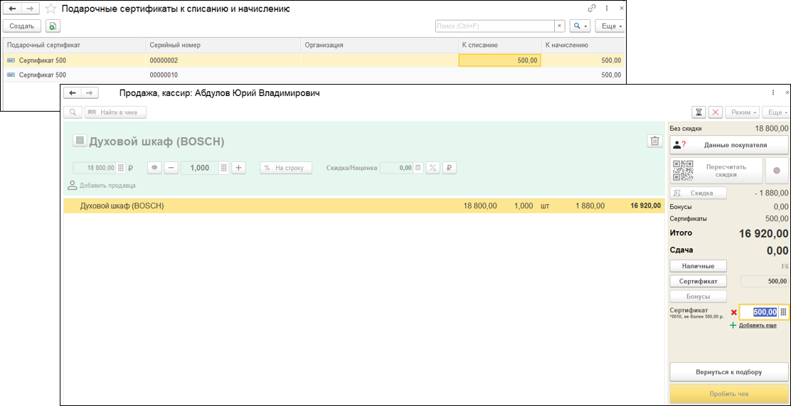 Оплатить покупку сертификатом можно сразу после его продажи. После пробития сумма к списанию будет добавлена к записи регистра.