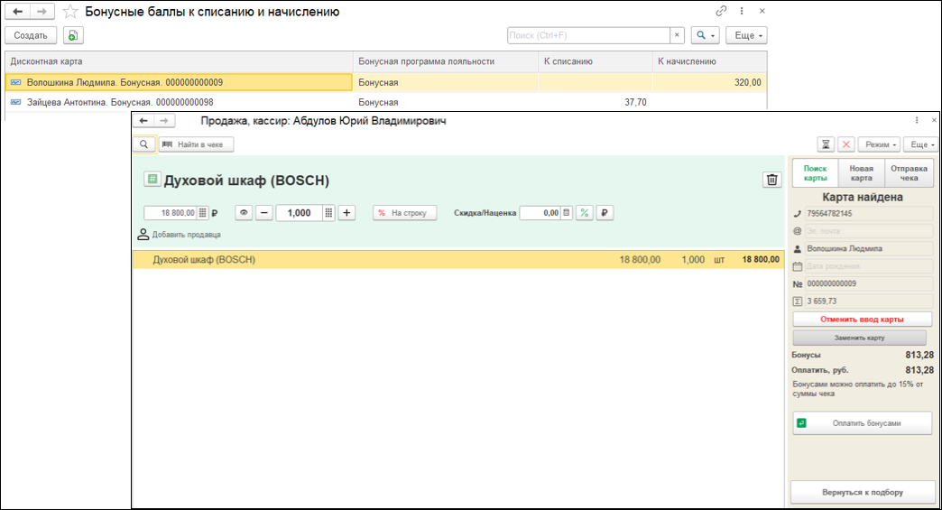 При совместной работе с автономным 1С:РМК с помощью сервера лояльности бонусные баллы начисляются сразу после продажи. После повторного считывания карты лояльности данные о баллах к списанию и начислению уже будут учтены в информации о бонусном остатке. Покупатель и кассир всегда смогут видеть актуальный баланс.