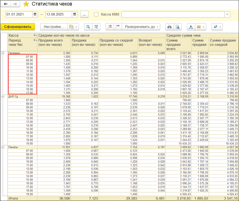 Анализировать и планировать нагрузку на кассы стало возможным по времени. Для этого в отчете "Статистика чеков" предусмотрена детализация "по периодам".