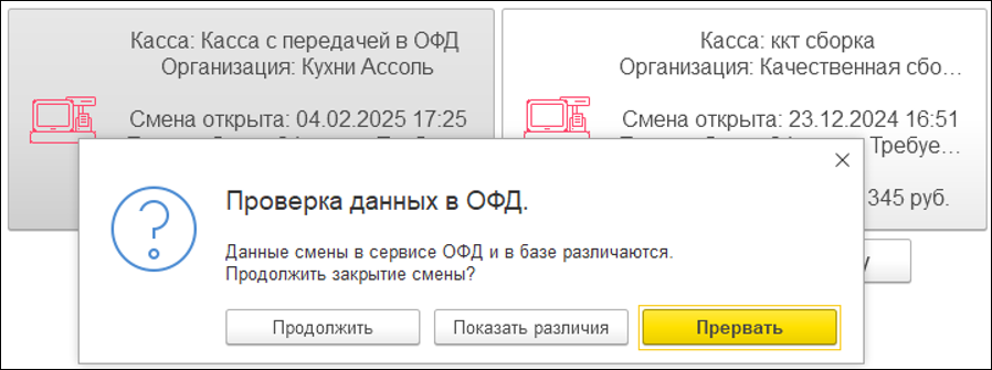 Статус чеков, по которым не была получена информация, примет значение "Нет данных". Для остальных случаев отобразится положительный или отрицательный результат. При закрытии смены происходит сравнение данных текущей смены с данными в ОФД. Здесь можно прервать операцию, показать различия или продолжить выполнение операции.