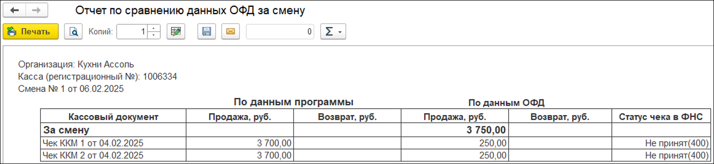 При нажатии кнопки "Показать различия" будет сформирован отчет по каждому Чеку ККМ. Можно легко сравнить данные программы и ОФД и устранить ошибку.