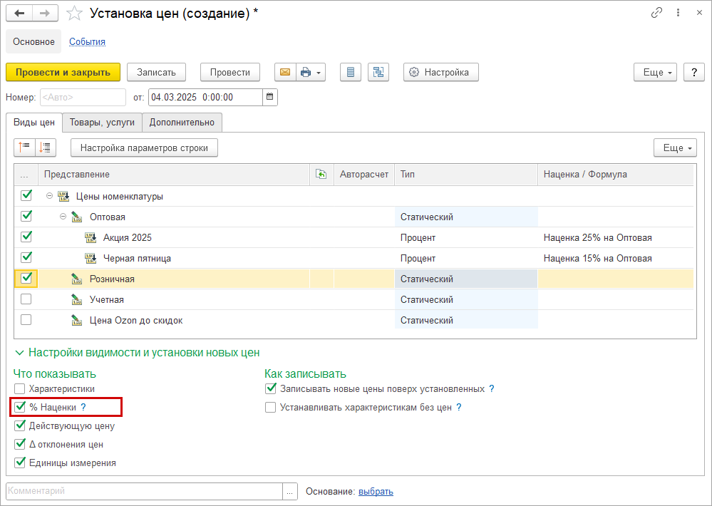 Сделали работу с ценами удобнее. В документ "Установка цен" добавили новые возможности расчета и назначения цен: