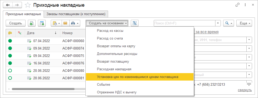 В документ "Установка цен", созданный из приходной накладной по изменениям цен поставщика, теперь включаются не только товары, у которых изменились цены, но и все новые товары.