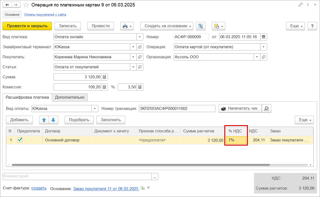 Для индивидуальных предпринимателей (ИП) и организаций на упрощенной системе налогообложения (УСН) со специальной ставкой НДС 5% или 7% при формировании ссылки для получения оплаты через сервис ЮKassa из документов "Счет на оплату", "Заказ покупателя", "Расходная накладная", "Акт выполненных работ", "Прием и передача в ремонт" указывается величина и сумма налога по новым ставкам.