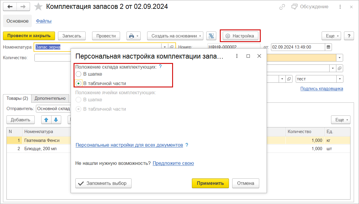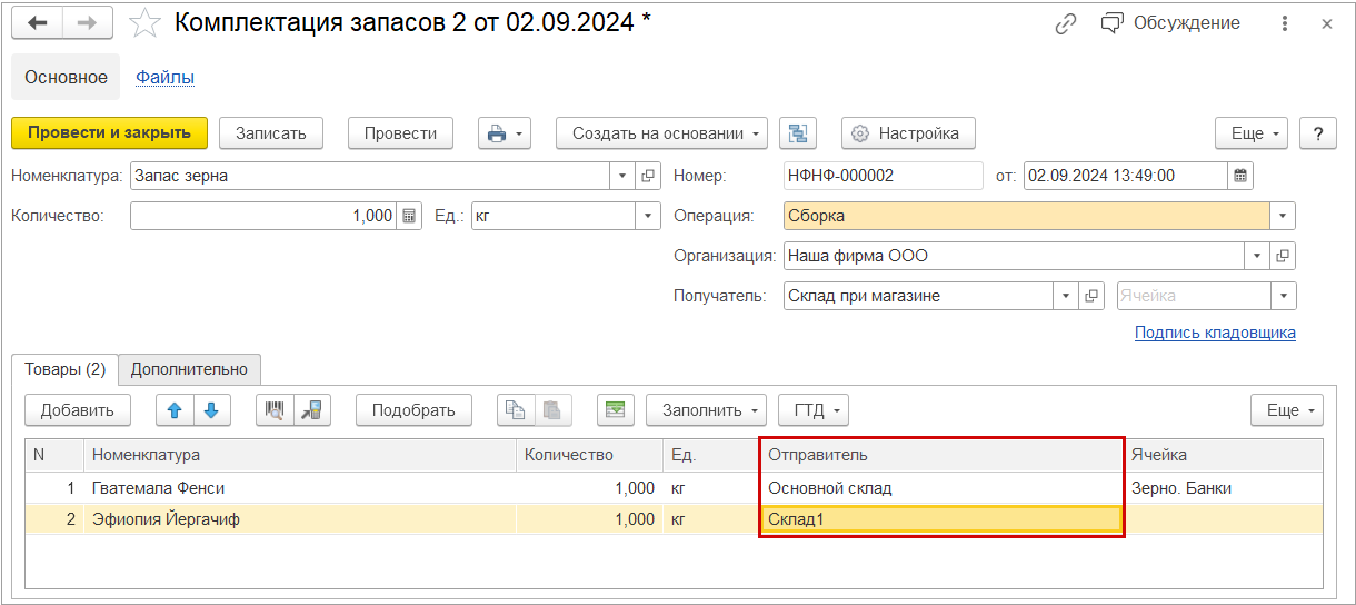 Если для операции "Сборка" выбрать отражение в табличной части, собрать комплектацию можно из составляющих из разных складов. Например, можно отразить сборку комплекта в магазине составляющими с разных складов.
