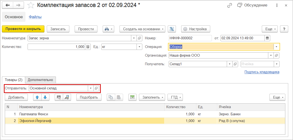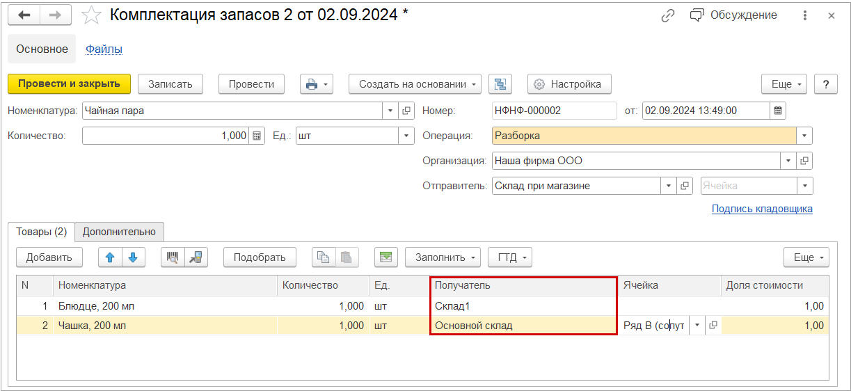 Аналогичным образом при операции "Разборка" можно разобрать комплектацию и отправить комплектующие на разные склады.