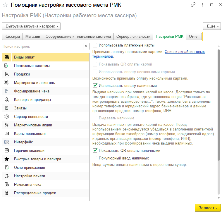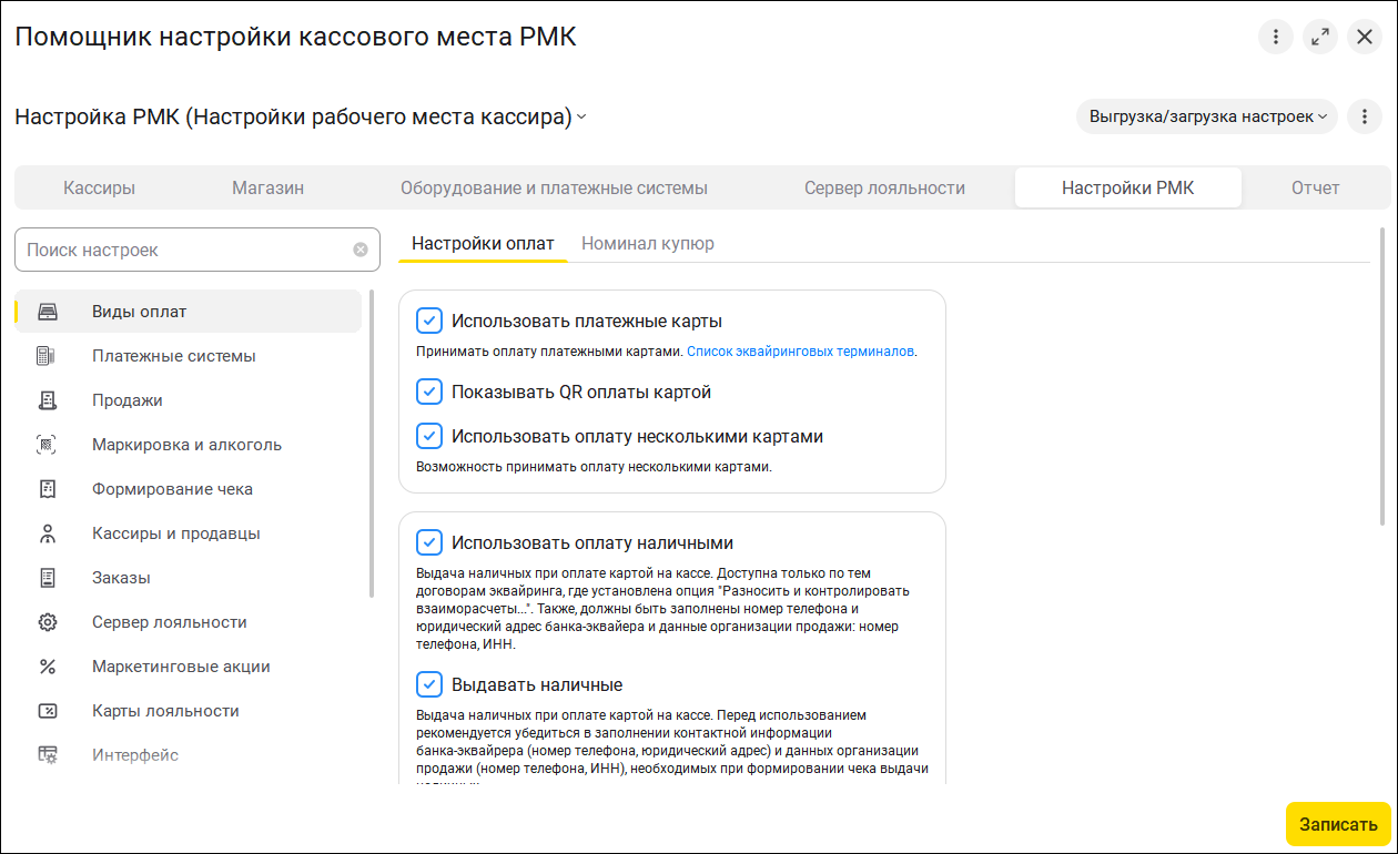 Зависимые настройки теперь скрыты до активации основного параметра — это исключает ошибки и упрощает процесс. А за счет единообразных подсказок вместо устаревших команд все опции выглядят и воспринимаются одинаково легко. Так, если используем "Покупюрный ввод наличных", то справа от "Настроек оплат" отобразится закладка "Номинал купюр".