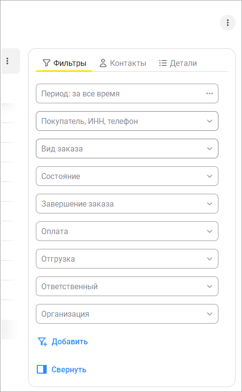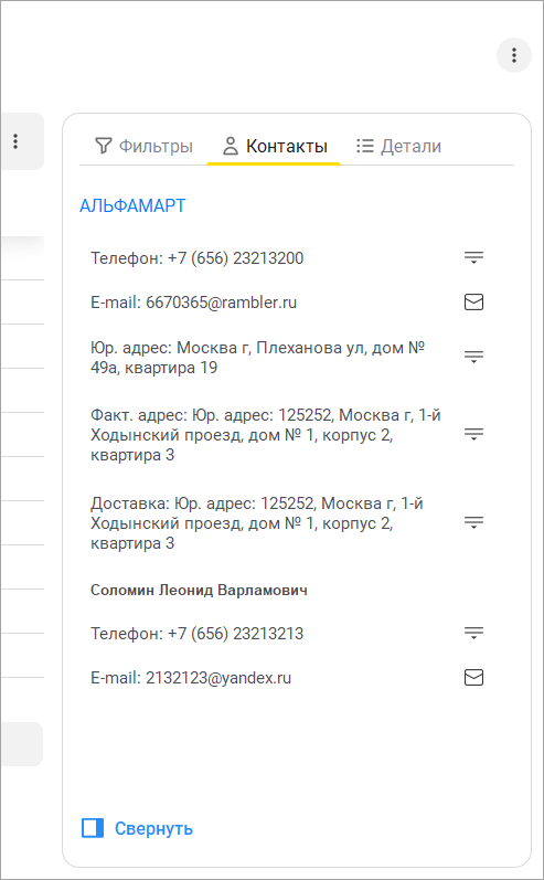 Правая панель теперь состоит из трех страниц: Фильтры, Контакты, Детали. На каждой из них скомпонована краткая информация о выбранном документе.