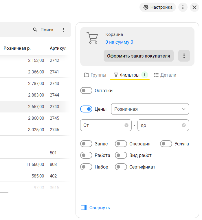 Остатки товаров отображаются под количеством, а информативные остатки можно посмотреть по кнопке "Остатки". "Код" и "Артикул" теперь отображаются отдельно.