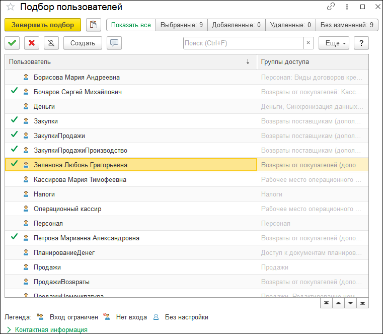 Программа позволяет создавать код сотрудника и выводить его на печать. В "Группу доступа" сотрудников можно добавлять через функцию подбора пользователей. Здесь же показываются уже добавленные пользователи. Удаление из группы выполняется нажатием на значок "Крестик".