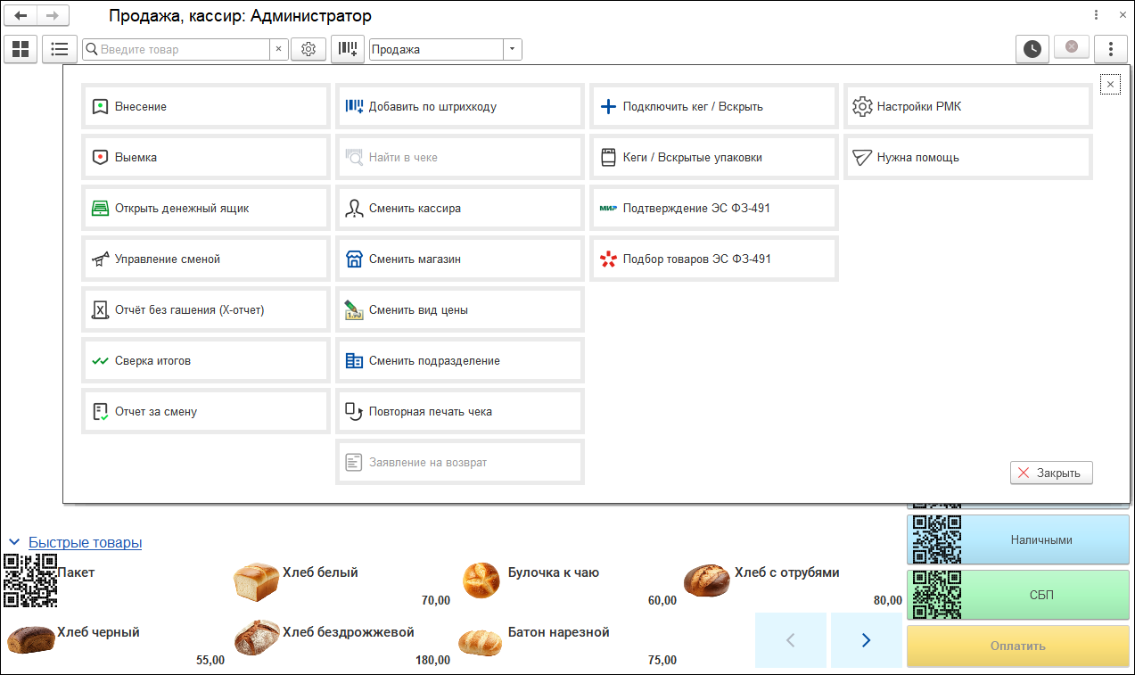Дополнительно на каждой кнопке расположен QR-код для считывания, с том числе для СБП. Удобно, если кассир в основном пользуется сканером.