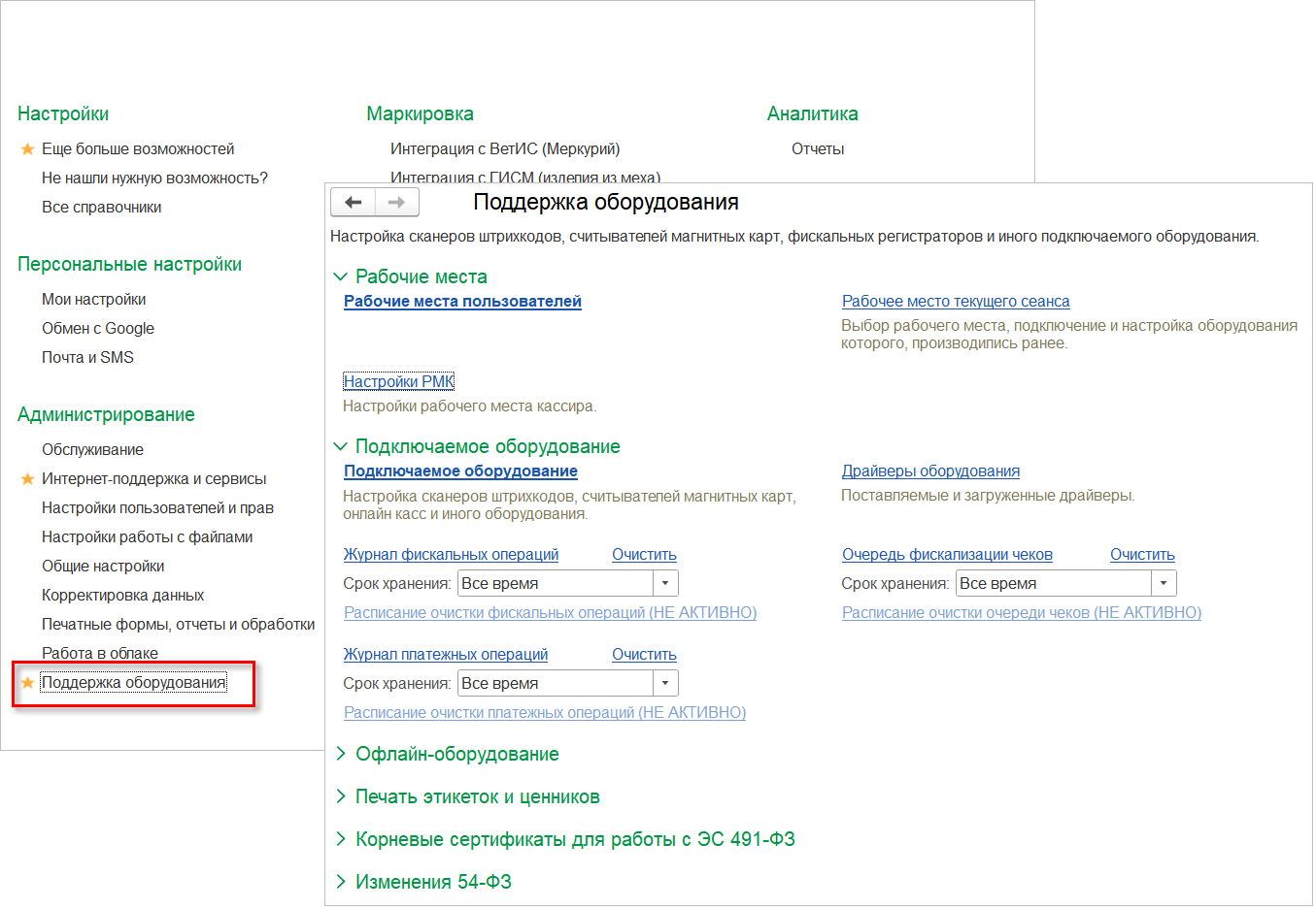 Добавлена панель администрирования БПО, что упрощает работу и позволяет более эффективно и централизовано управлять оборудованием. Появилась возможность открывать журналы фискальных операций, платежных операций и очереди чеков, а так же производить настройку периода хранения и расписания очистки журналов операций от устаревших данных.