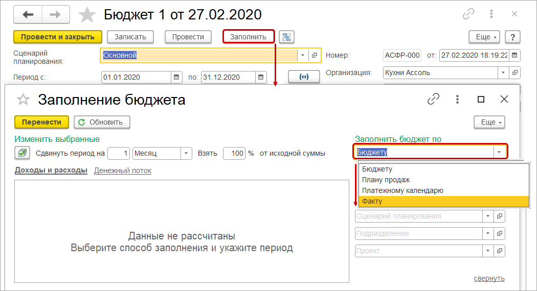 Добавили новые возможности заполнения бюджета: из платежного календаря, плана продаж, другого бюджета и на основании фактических данных. Теперь в документе "Бюджет" по команде "Заполнить" открывается форма для выбора, на основании чего заполнить бюджет.