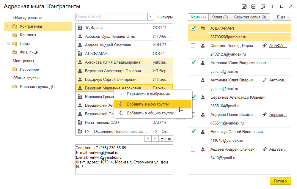 При переносе в правый список выбирается не только сам адресат из списка, но и связанные с ним контакты и контрагенты.