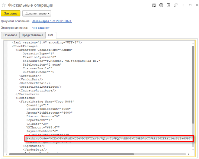 При пробитии чека ККМ выполняется проверка кодов маркировки ККТ, при этом сам код помещается в фискальные данные чека.