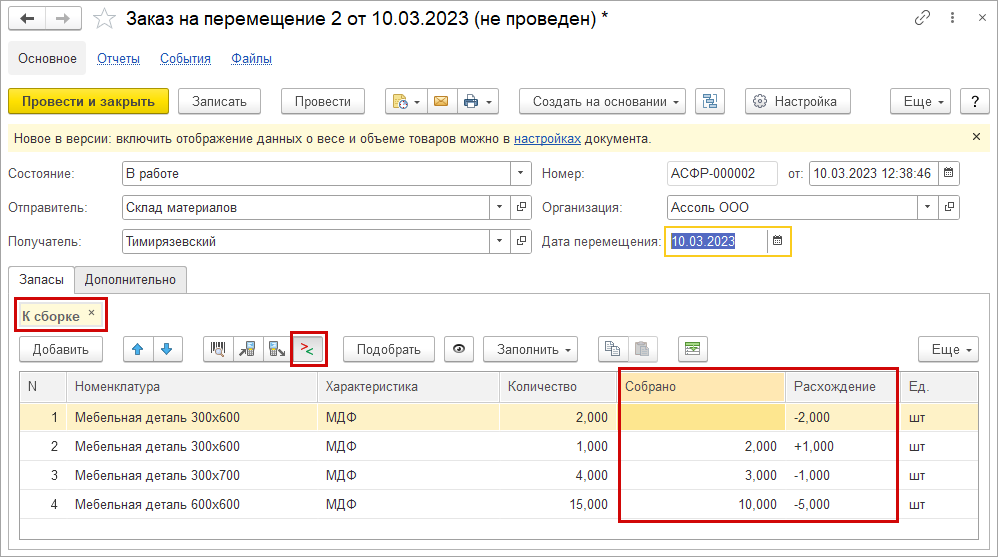неполную сборку и расхождения при приемке перемещения, а затем выгружать эту информацию в учетную систему 1С.