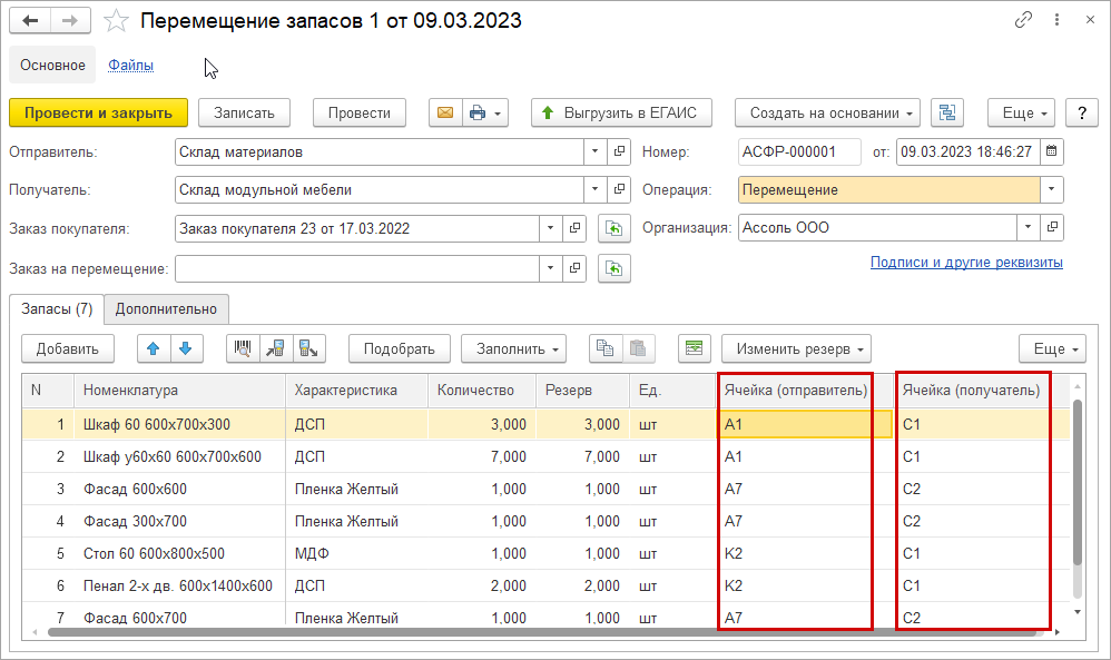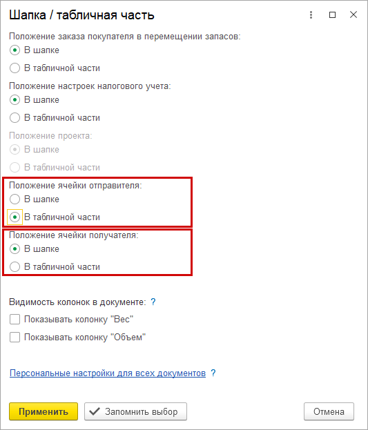Для документов "Отчет переработчика" и "Перемещение по ячейкам"