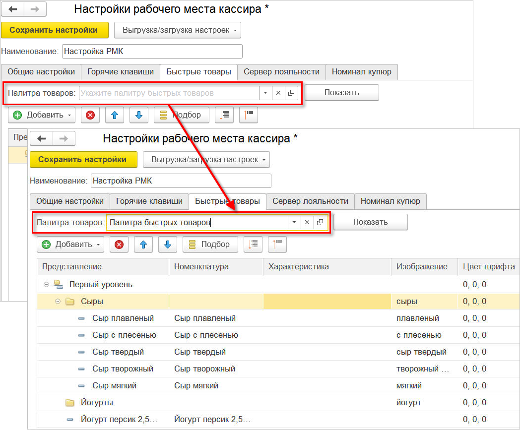 Если палитра товаров не выбрана и при этом добавить элементы быстрых товаров, то при сохранении настройки РМК произойдет создание новой палитры с этими элементами.