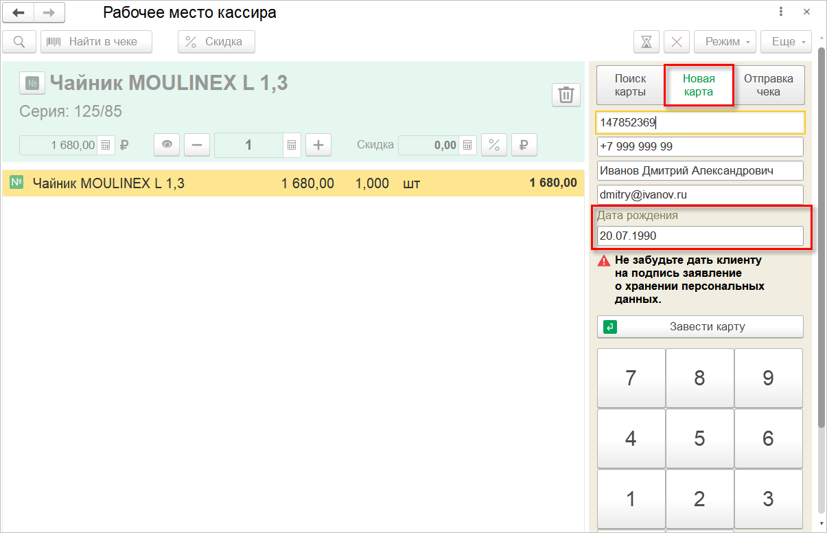У кассира появилось еще больше возможностей ввода информации на сенсорном экране без использования физической клавиатуры. Теперь с цифровой клавиатуры на форме РМК можно ввести номер карты или телефона, а также дату рождения.