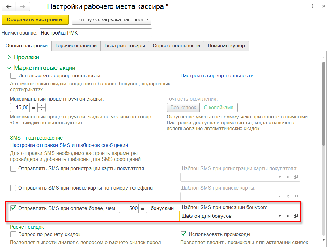Указать максимальную сумму можно в разделе Маркетинговые акции настроек РМК. Здесь же задается шаблон с текстом, который будет отображаться в sms-сообщении при списании бонусов.
