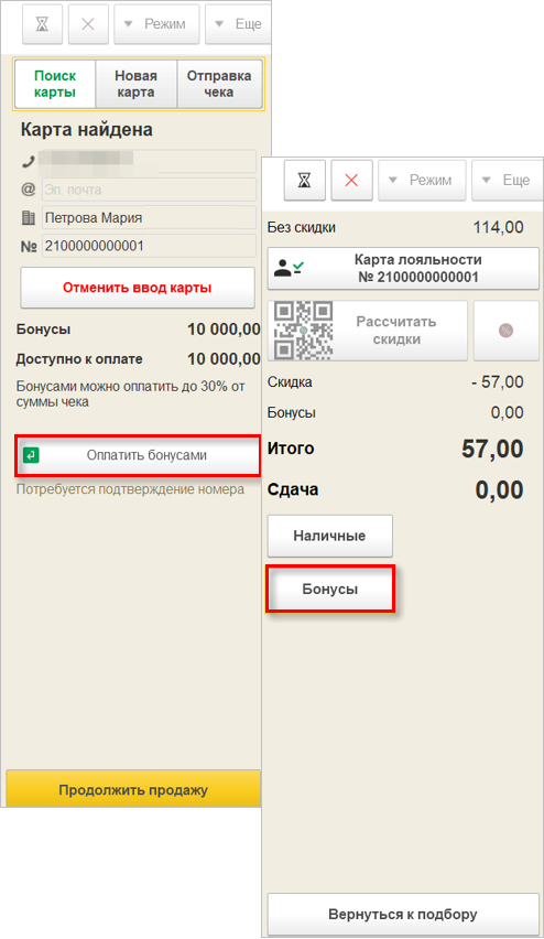 Если сумма списания бонусов превысит указанный в настройке лимит, будет запрошен код подтверждения.