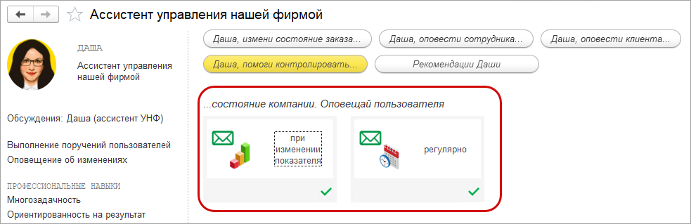 В ассистенте управления нашей фирмой появился новая категория «Даша, помоги контролировать…» c разделом «состояние компании. Оповещай пользователя». В новых навыках ассистента управления нашей фирмой можно настроить периодичность отправки оповещений, способ отправки, список показателей и условия для отправки. Для этого добавили два новых навыка «при изменении показателя» и «регулярно»