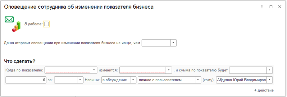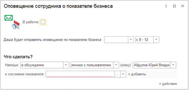 В навыке оповещения сотрудника при изменения показателя бизнеса можно настраивать частоту отправки сообщений и условия, при которых будет происходить уведомления пользователя. В навыке можно отслеживать изменения динамики, сравнения с другим показателем и сравнение с фиксированным значением показателя.