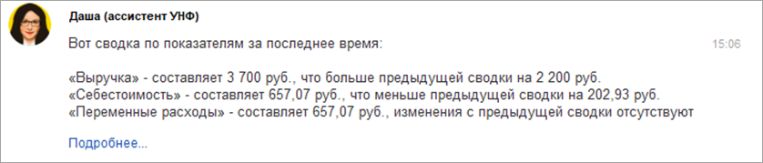 Из сообщений ассистента можно открыть отчет "Анализ бизнеса" для получения дополнительной информации о значениях показателей по ссылке "Подробнее". В регулярных сводках по показателям помимо текущего значения показателя будет отображаться сравнение с предыдущей сводкой. При отправке оповещений об изменениях состояния показателей создается карточка анализа бизнеса с аналогичными настройками, как в навыке ассистента.