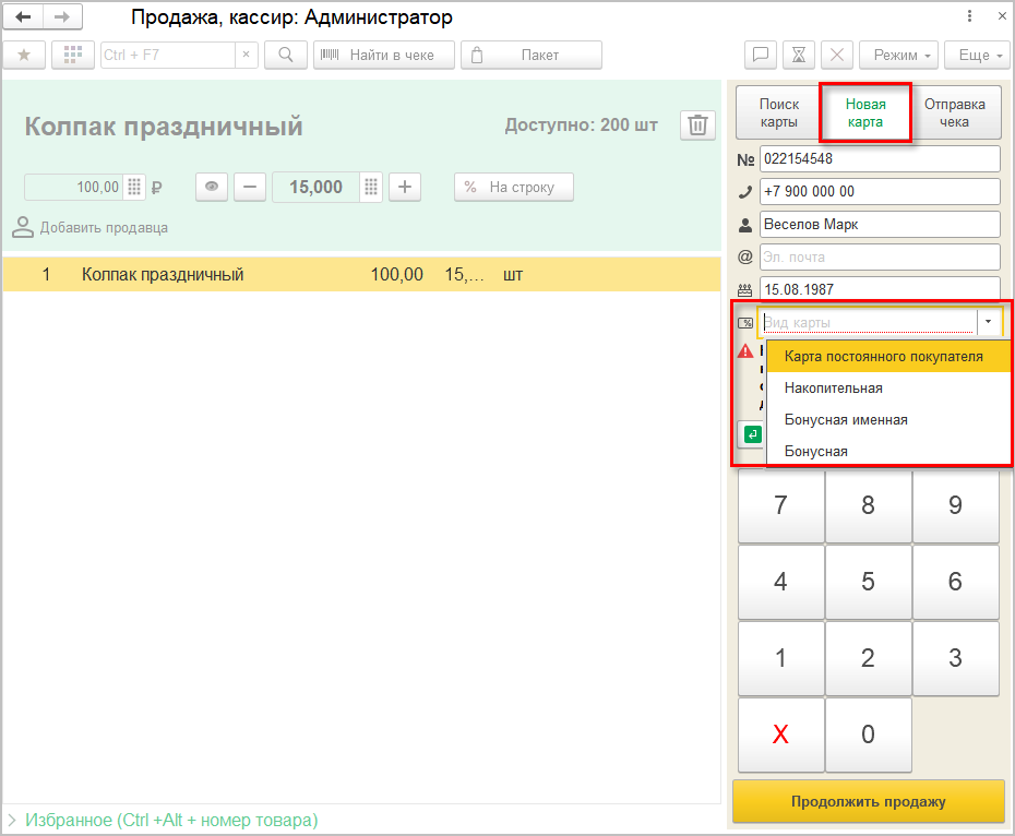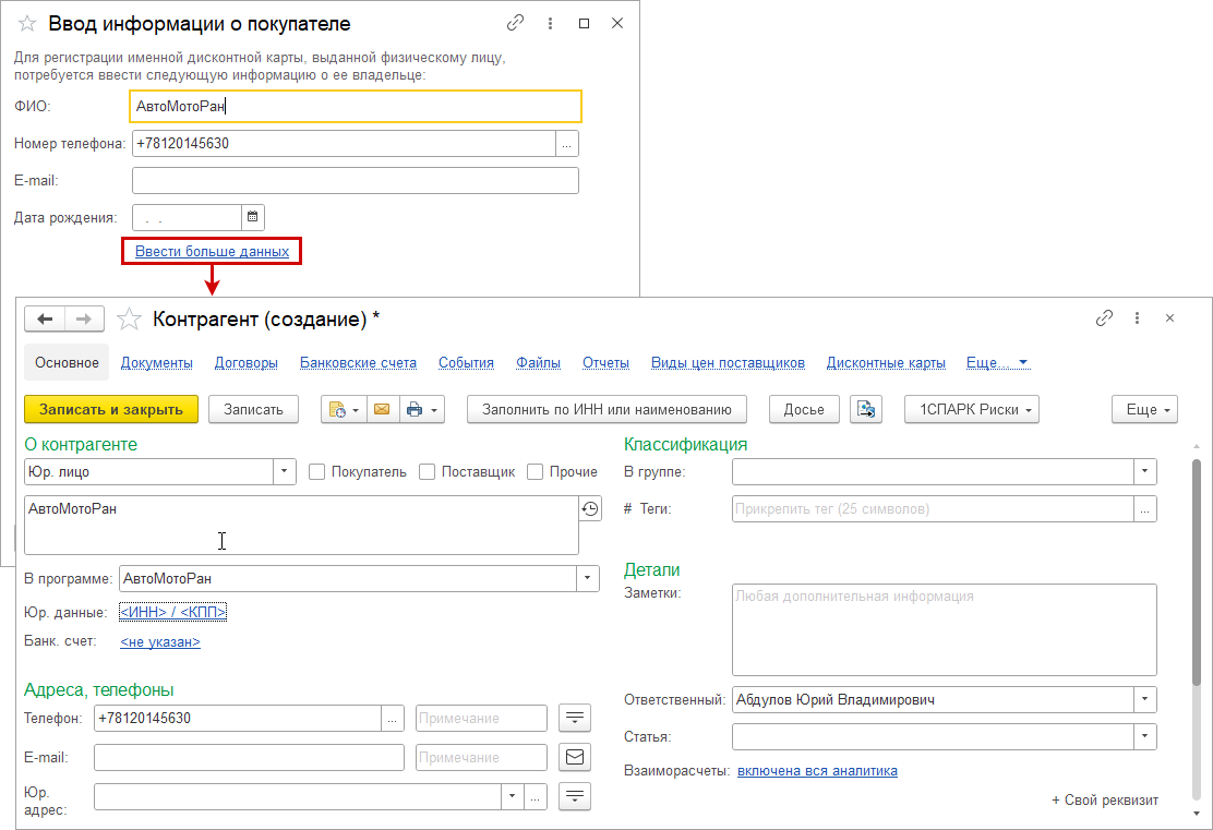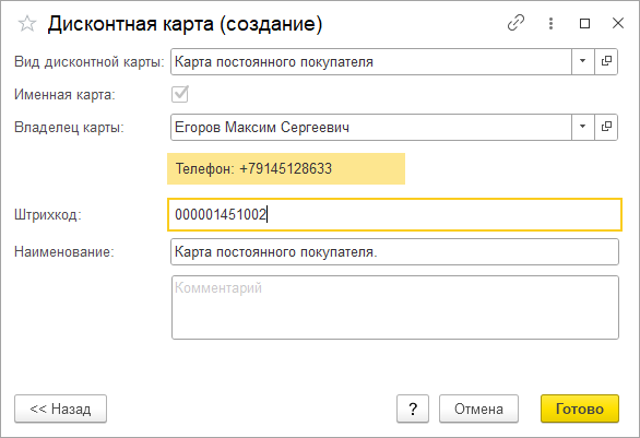 Создание дисконтных карт при продаже оптом и в розницу без использования РМК стало удобнее. В помощнике создания дисконтной карты добавили возможность быстрого создания контрагента с минимальным количеством заполнения информации без открытия карточки контрагента. Появился этап, на котором можно ввести ФИО покупателя, номер телефона, электронную почту и дату рождения. Теперь менеджеры отдела продаж могут выдать дисконтную карту с минимальной информацией без открытия справочника "Контрагенты".