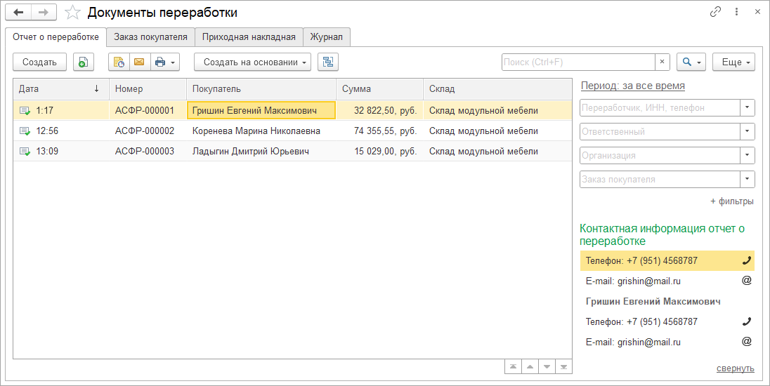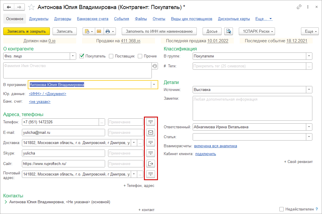 В документе "Заказ-наряд" при добавлении или изменении контрагента автоматически заполняется поле "Адрес доставки". В документе "Заказ покупателя" информация о получателе заполняется контактной информацией из карточки контрагента и сведениях об основном контактном лице.