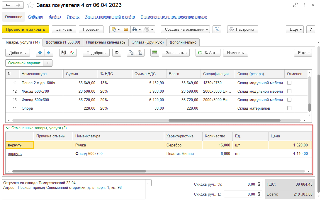 После записи документа все отмененные товары будут перенесены в таблицу “Отмененные товары, услуги”, которая появится ниже.